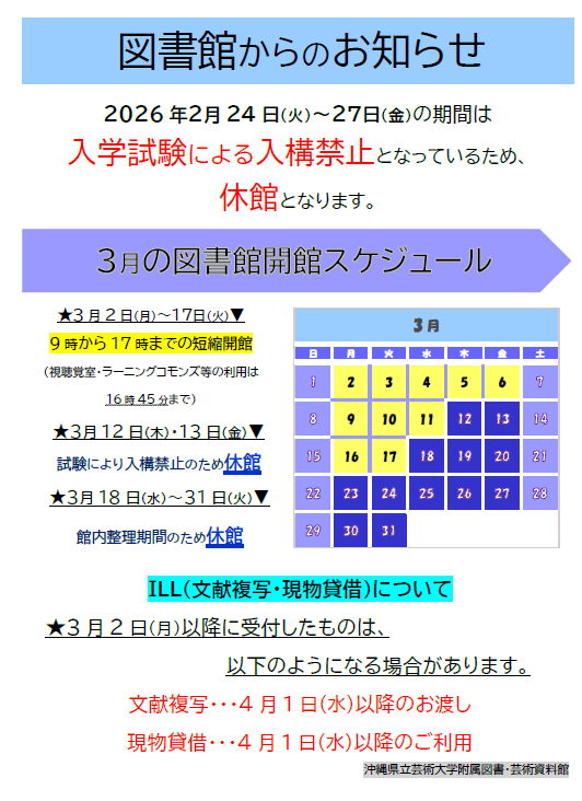 ・3/12(木)~13(金)入学試験(後期)にかかる入構禁止のため休館します。